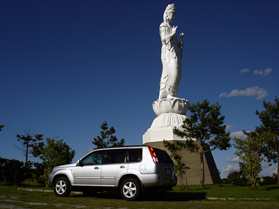 芦別。天気イイですねー。 大観音と2ショット。