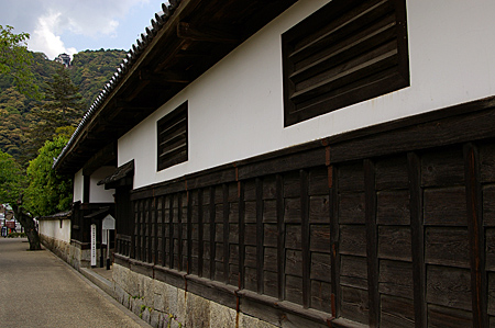 橋を渡って来ました。 香川家長屋の塀。