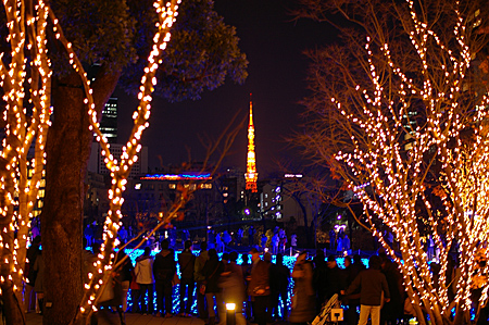 今度は、東京ミッドタウン。 ド派手な青いイルミネーションの周りは、黒山の人集り。。